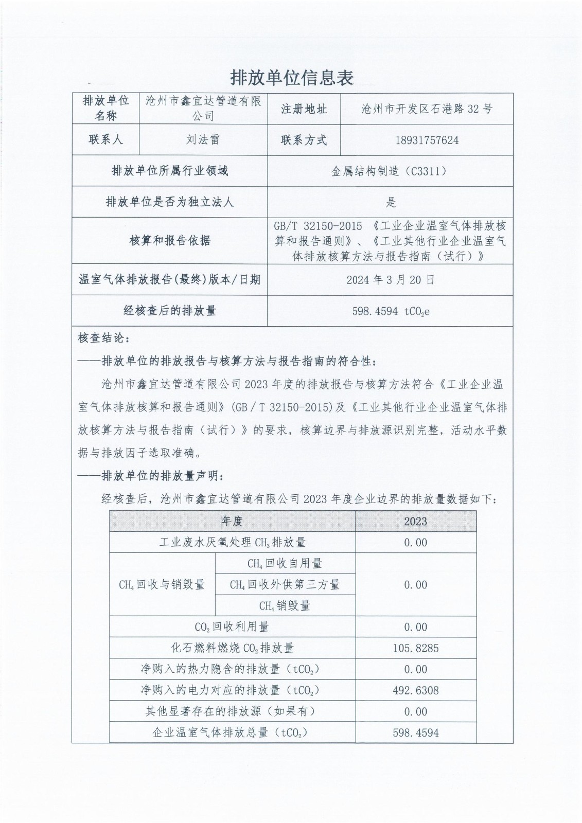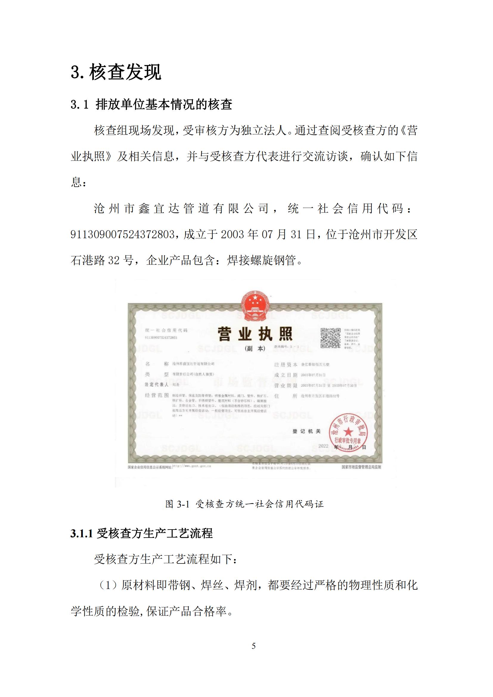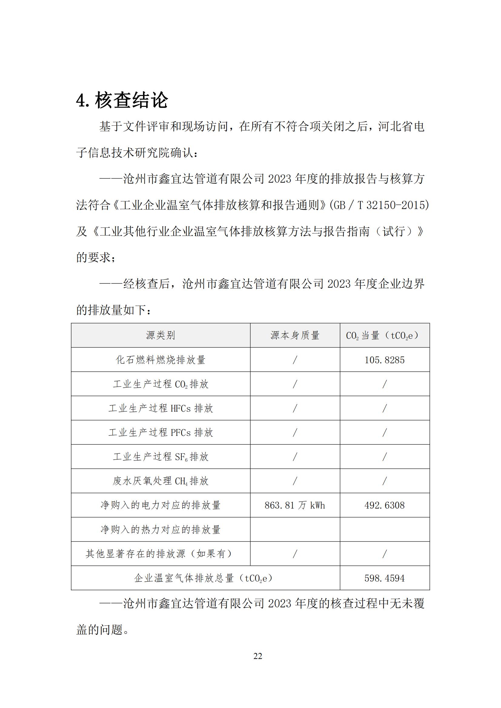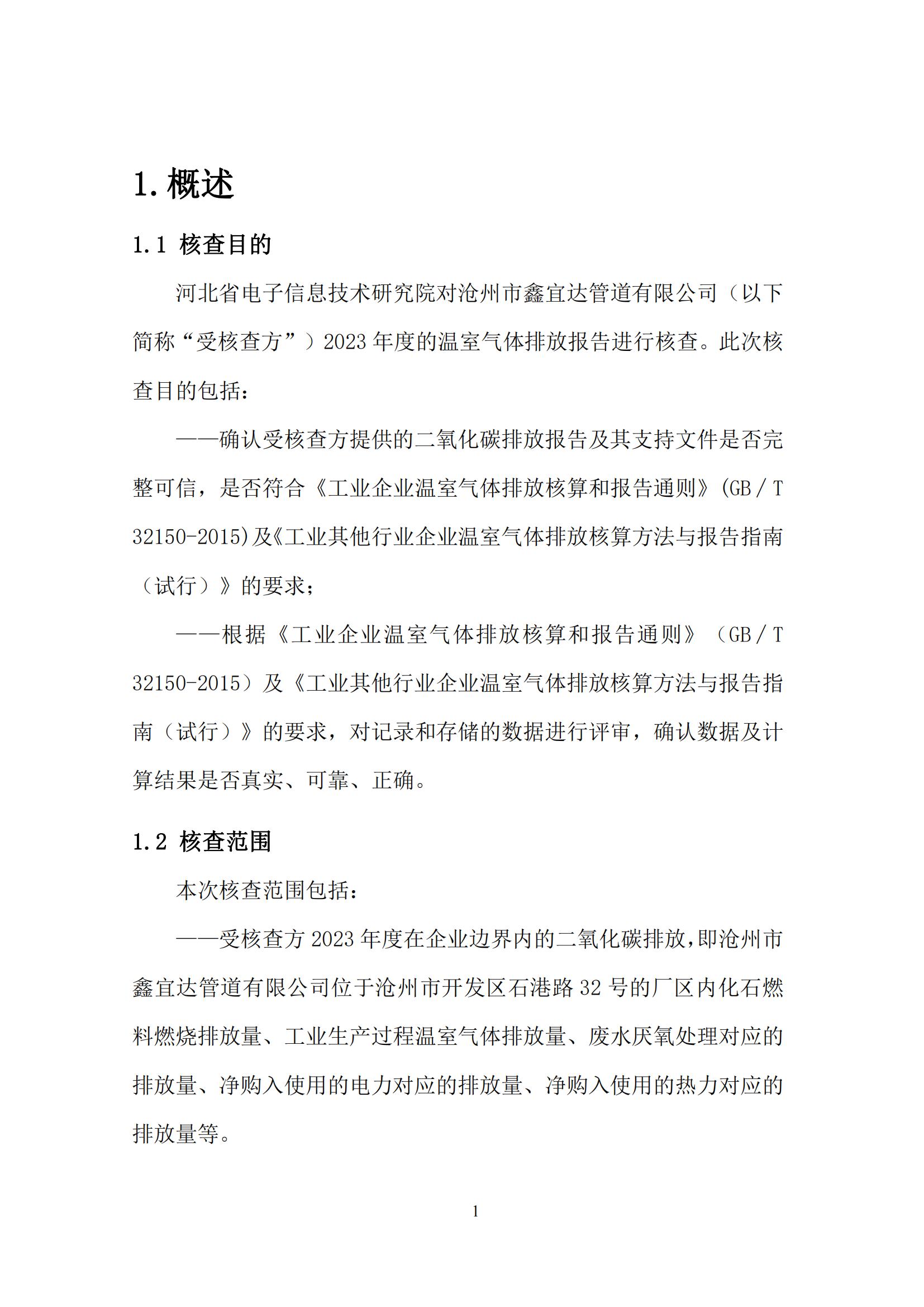 滄州市鑫宜達(dá)管道有限公司2023年度溫室氣體排放核查報(bào)告